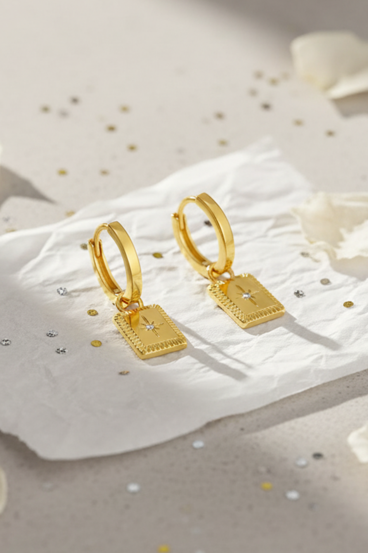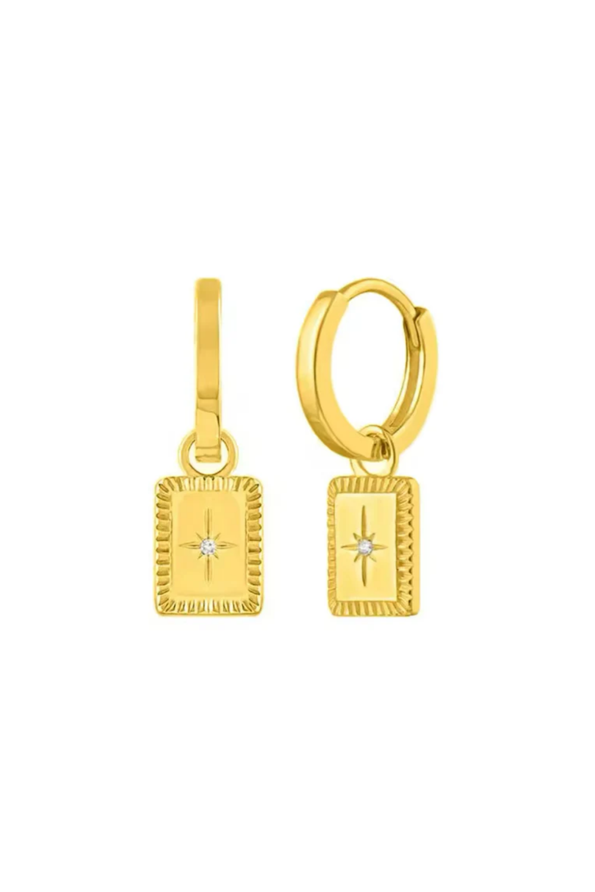 The Ava Earring is a gold-plated rectangle pendant design with a dainty imitation diamond nestled in the centre of the charm. Also available in a sterling silver option. Tarnish-free and perfect for effortless everyday wear, from coastal days to city strolls.