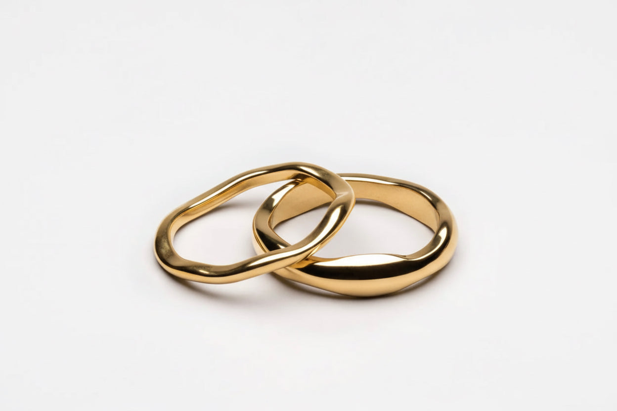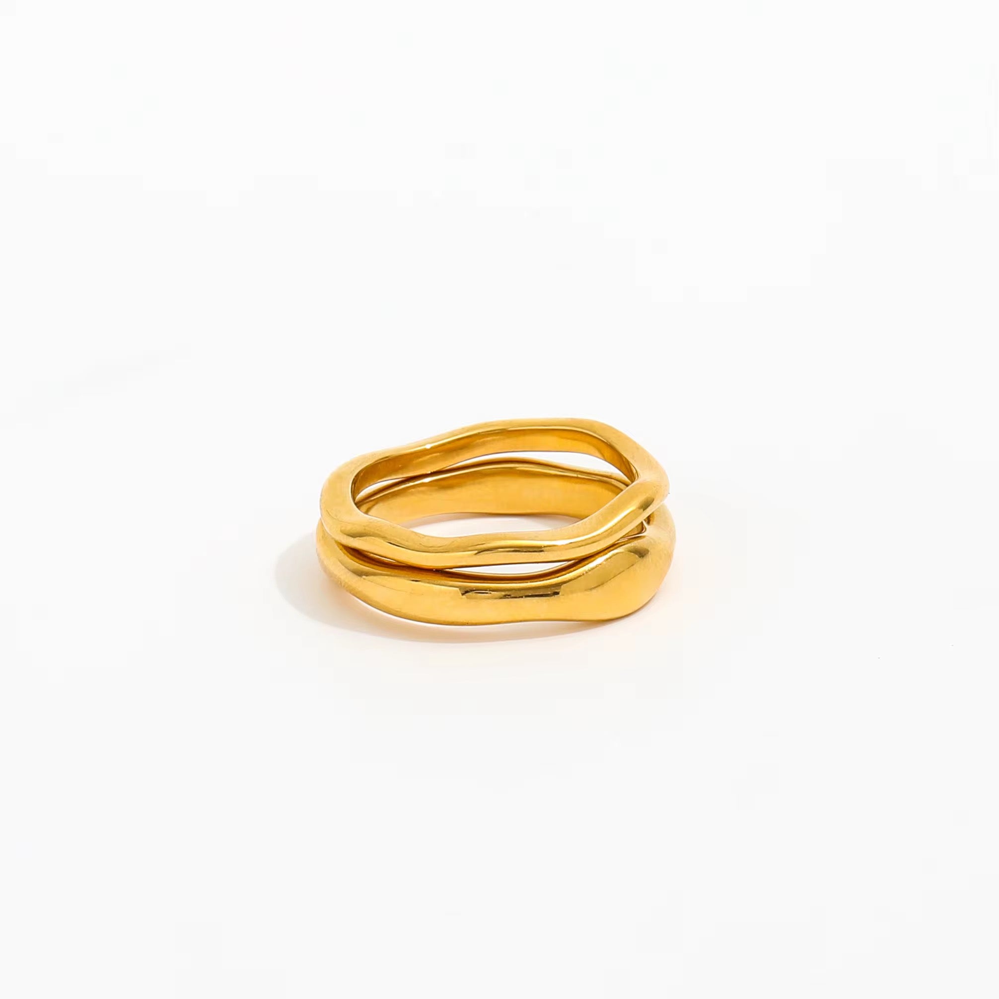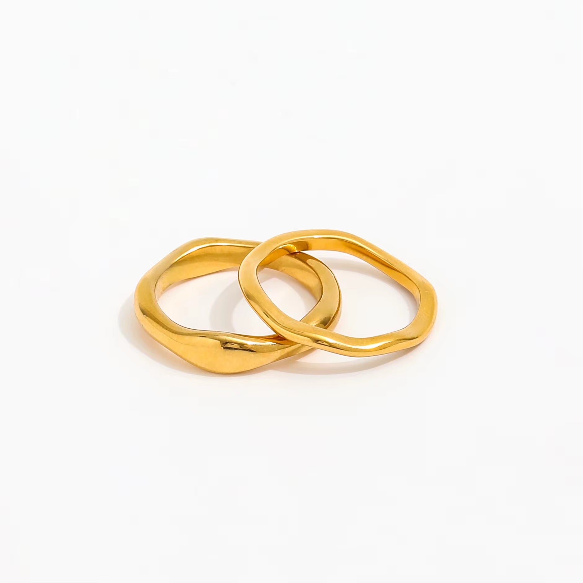 Ava rings, a gorgeous plain wavy band, there is 2 size band widths and look great stacked. Stainless steel and 18k gold plated. Water resistant and hypoallergenic. This 18k gold-plated ring features a wavy band that’s as unpredictable as the next set of waves, buy one or both and stack.